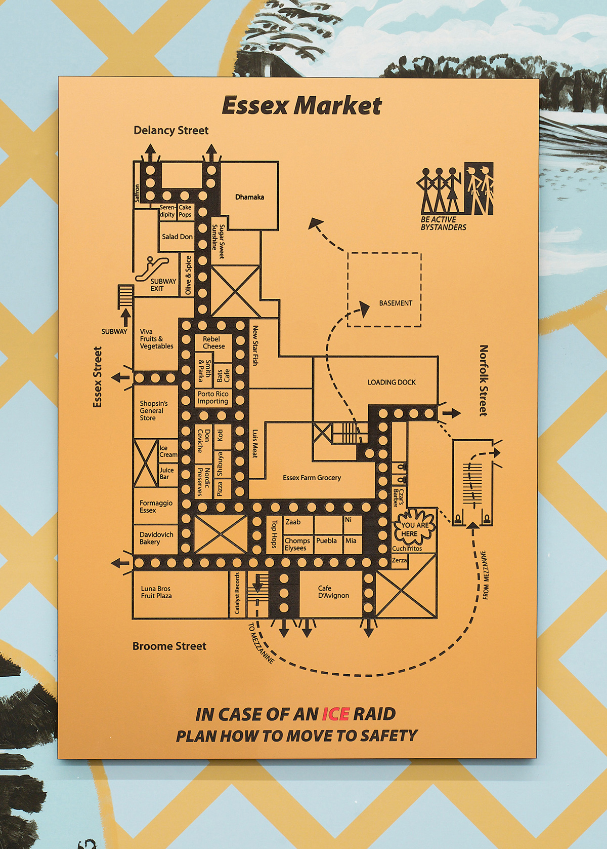 This long-term project evolves as more venues commission their own customised ICE-Escape signs. The signs, developed through conversations with site users, draw attention to the fact that people are living in daily fear of being caught in a raid by Immigration and Customs Enforcement, and encourage community preparedness in the face of ICE aggression.
