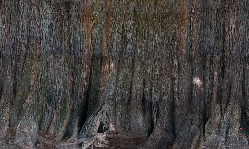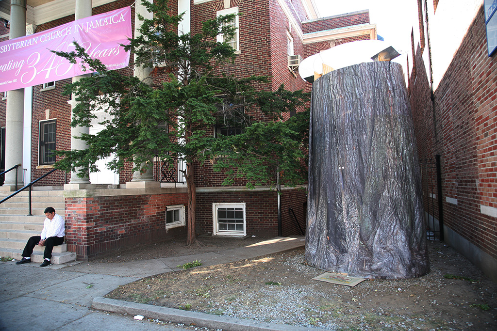 Medium: Wood, Plywood, Weathertyte billboard vinyl with tree bark image, Coroplast, solar panel and lamp, rain collecting roof. 8’x 6’ x13’