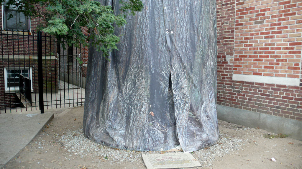 Public art, 2007. Fictitious design solution to the housing needs of urban migrant workers, who find it increasingly difficult to rent decent accommodation. By disguising the dwelling as a tree it doubles as ‘street beautification’ for planning purposes.